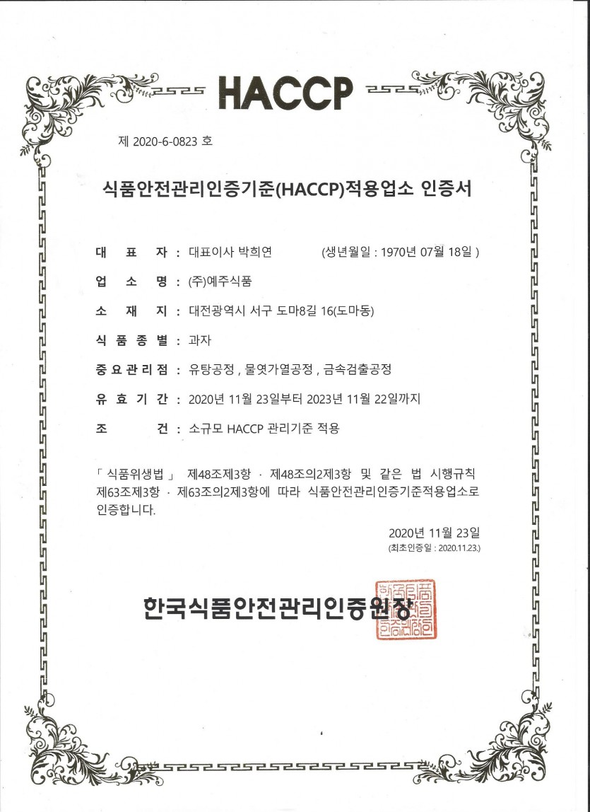 제2020-6-0823 식품안전관리인증기준(HACCP)적용업소 인증서