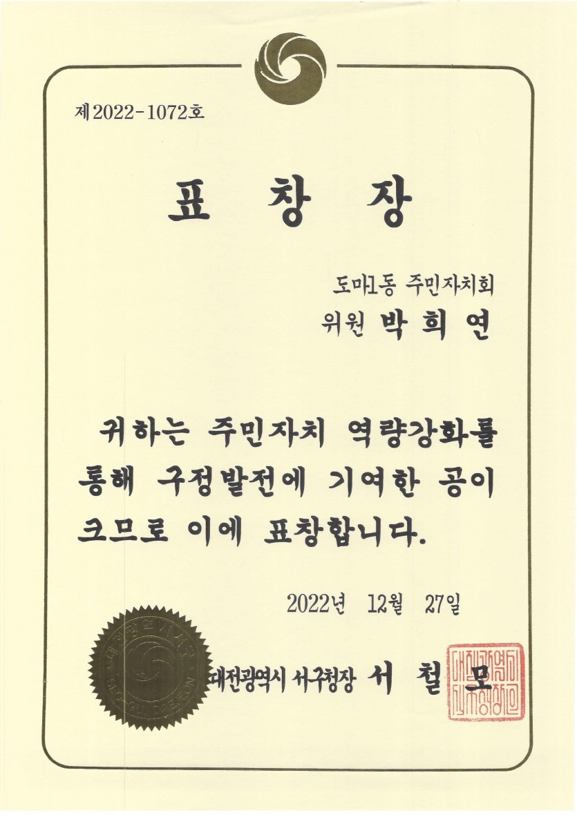 제 2022-1072호 대전광역시 서구청장 표창 페이지 정보 작성자최고관리자 댓글 0건 조회 3,695회 작성일 23-07-05 11:41 본문 <br/> 목록 이전글제 2023-013 (사)대전세종충남여성벤처협회 이사 임명장 23.07.05 다음글제 2022-16호 대전세종지방중소벤처기업청장 표창 23.07.05 댓글목록 댓글목록 등록된 댓글이 없습니다.