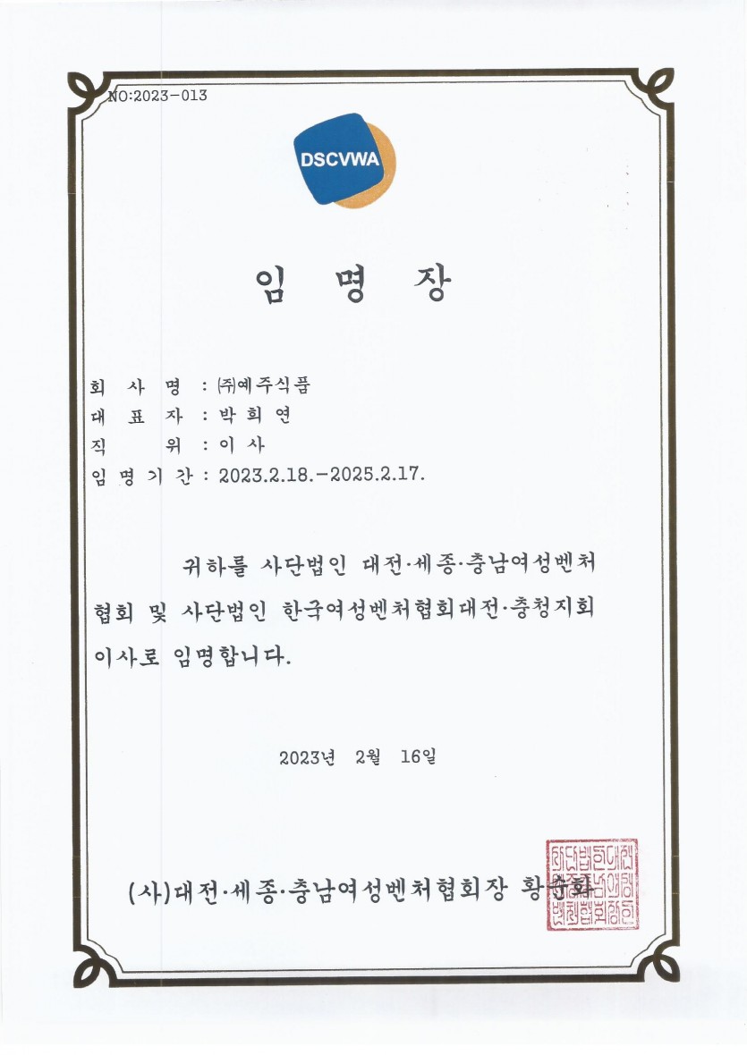 제 2023-013 (사)대전세종충남여성벤처협회 이사 임명장 페이지 정보 작성자최고관리자 댓글 0건 조회 3,825회 작성일 23-07-05 11:41 본문 <br/> 목록 이전글제 2023-107호 (사) 대한민국명장회 표창 23.07.05 다음글제 2022-1072호 대전광역시 서구청장 표창 23.07.05 댓글목록 댓글목록 등록된 댓글이 없습니다.